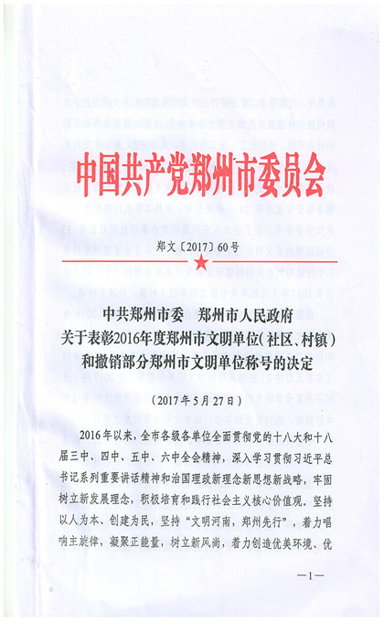 近日,中共郑州市委、郑州市人民政府下发了《关于表彰2016年度郑州市文明单位(社区、村镇)和撤销部分郑州市文明单位称号的决定》(郑文【2017】60号),授予郑州市第五十一中学“市级文明单位”荣誉称号。