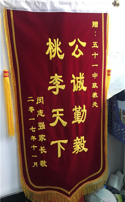 1月9日,李阿姨特地来到51中,给学校送来了锦旗,一定要当面表达对两位同学的衷心感谢,同时感谢51中培养出“雷锋式”的好少年。“包里有身份证和手机,还有好多张银行卡,我正发愁怎么补办,就接到了派出所的电话!真是太感谢了!我一定要当面谢谢这两个好孩子!感谢51中培养了品质这么好的孩子!”李阿姨再三表示。两位同学羞涩的笑着,摇着手说:“阿姨,不用谢,这是我们应该做的。”