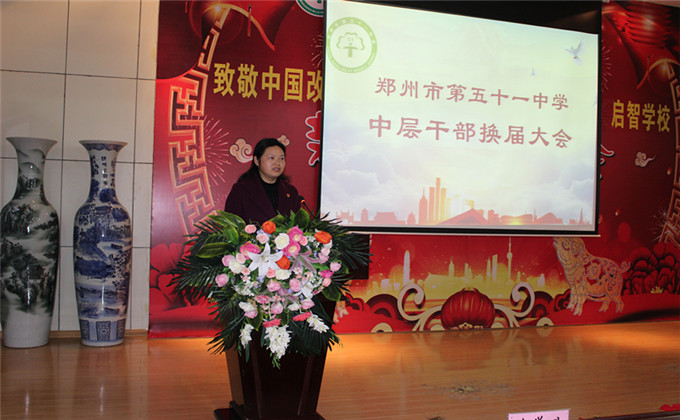 为进一步提升学校中层干部的执行力,不断加强中层干部队伍建设,促进学校内涵发展,根据市教育局关于学校中层干部换届工作总体部署,2019年3月14日下午,郑州市第五十一中学举办了中层干部换届大会,学校七位中层干部进行述职演讲。为保证述职成绩的公正、合理,学校特聘请市教育局财务处处长荆改强、市教育局实验教学装备中心主任张冬磊、市实验幼儿园园长郝江玉和学校领导、四位教师代表担任大会评委,党总支书记黄青云主持此次换届大会。