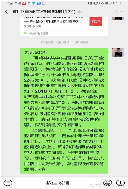 会议召开前夕,全体教师在学校工作群里学习了与师德师风相关的文件,领会了文件精神,校领导及中层干部成员发挥模范带头作用,集中召开了专题会议。警示会上,工会主席秦文建详细传达了《郑州市教育局关于“十一”长假期间严禁在职教师违规办班、有偿补课代课的通知》要求,并特别强调,坚决不能出现:组织、要求学生参加有偿补课;与校外培训机构联合进行有偿补课;为校外培训机构有偿补课提供教育教学设施或学生信息;在职中小学教师组织、推荐和诱导学生参加校内外有偿补课;在职中小学教师为校外培训机构和他人介绍生源、提供相关信息;在职中小学教师参加校外培训机构或由其他教师、家长、家长委员会等组织的有偿补课等行为,以上违反师德的行为,一经查实,务必严惩,绝不姑息。